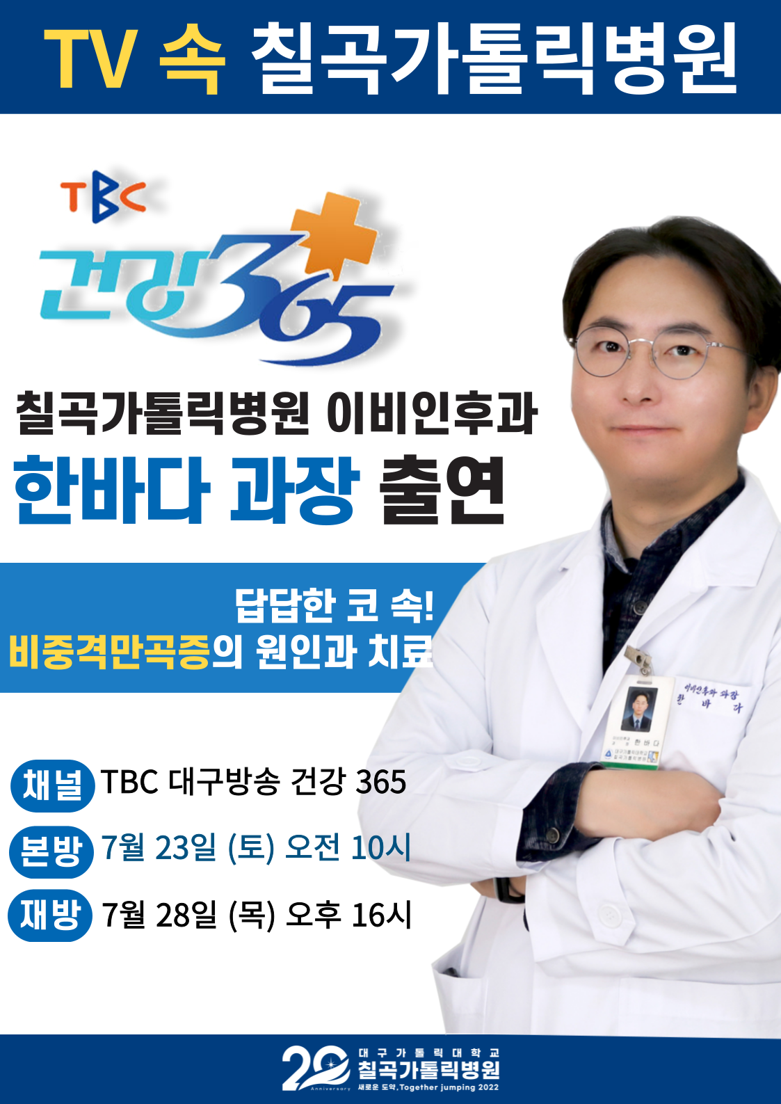 새로운 도약, Together jumping 2025! 칠곡가톨릭병원입니다. 7월 23일 토요일에 방송되는 TBC 클리닉 건강 365에 한바다 이비인후과장님이 출연하십니다. 비중격만곡증으로 인해 일상생활을 괴롭게하는 코막힘을 치료 및 수술하는 방법과 예방하는 법까지 모두 알려드릴 예정이오니 7월 23일 토요일 오전 10시! 놓치지 말고 본방사수해 주셨으면 좋겠습니다 :D 본방송 : 7월 23일 (토) 오전 10시 재방송 : 7월 28일 (목) 오후 4시 |