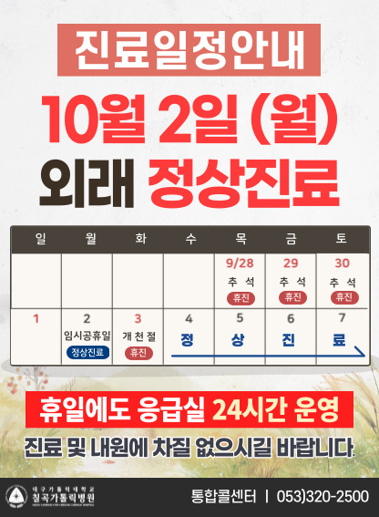 2023년 9월 28일 ~ 9월 30일은 추석 연휴, 10월 3일은 개천절로 휴진입니다. 단, 10월 2일 임시공휴일은 고객분들의 불편함을 최소화하고, 의료공백을 줄이기 위해 모든 외래 진료는 정상적으로 시행합니다. 9월 28일~30일 추석 연휴와 10월 3일 개천절은 연휴로 인해 모든 외래 진료는 휴진이오니 진료 및 내원 시 차질 없으시길 바랍니다. 특히 약을 정기적으로 복용하셔야 하는 분들은 휴진 일정을 반드시 참고 하셔서 미리 넉넉하게 처방 받으시고, 휴진 기간동안 불편함을 겪지 않도록 확인 부탁 드립니다. 추석연휴와 개천절을 포함한 모든 공휴일에도 칠곡가톨릭병원 응급실은 365일 24시간 내내 전문의 5인이 진료 하오니 갑작스러운 응급 상황 발생 시 당황하지 마시고 칠곡가톨릭병원 응급실로 신속히 내원하여 주시기 바랍니다. |