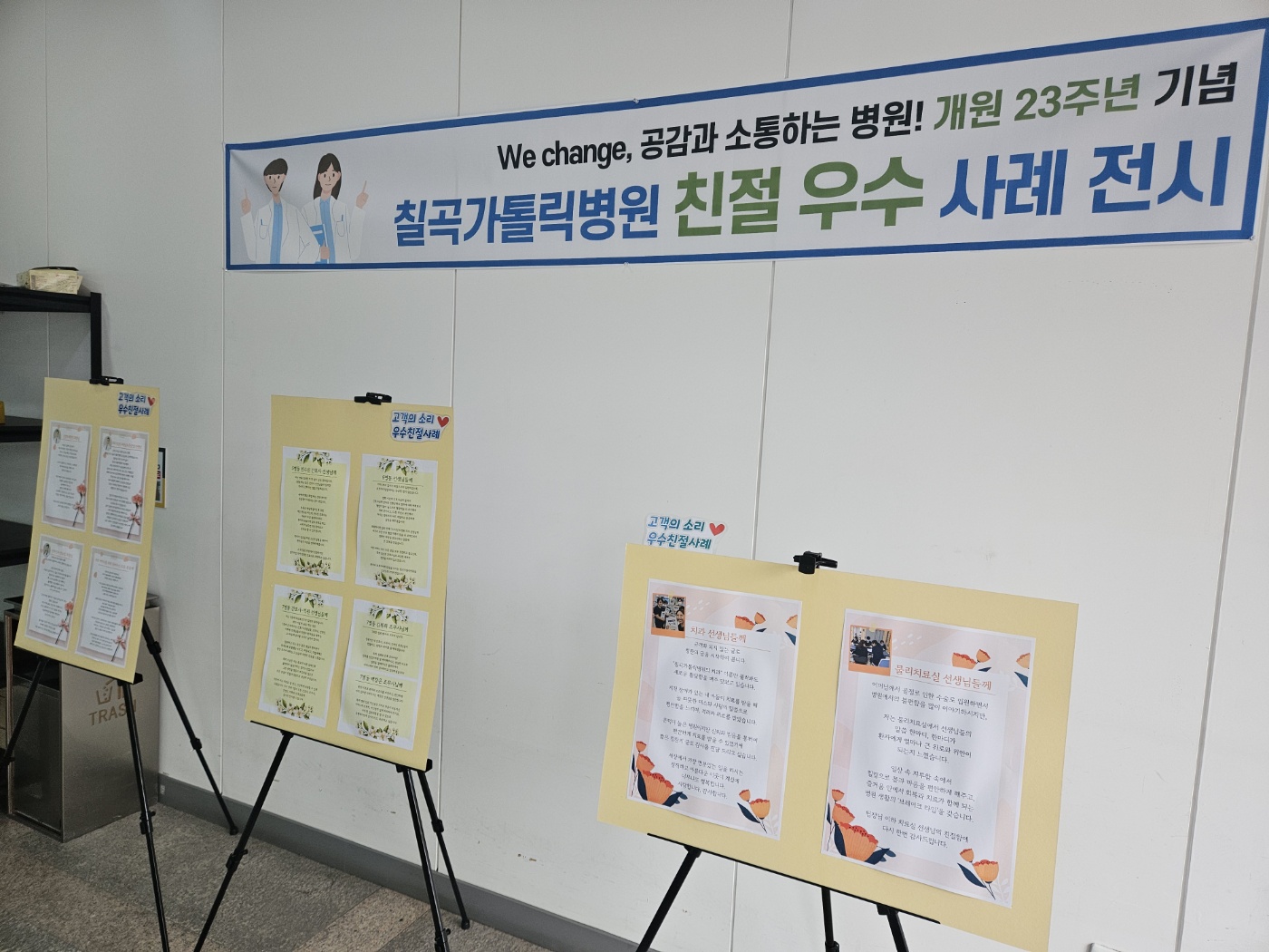 칠곡가톨릭병원 개원 23주년을 기념하며 2024년 고객의 소리 우수 친절사례를 모아서 전시회를 개최하였습니다. 공감과 소통의 첫번째 스텝! 많은 환자분들이 남겨주신 고객의 소리함에서 함께 공유하고 싶은 말들을 담아 3월 한 달간 2층 입구에 작은 전시회를 마련했습니다. 의료진과 직원들을 향한 감사한 마음이 담긴 메시지와 함께 따뜻한 봄을 맞이 하는 3월이 되었으면 합니다! 앞으로도 감사한 말들을 담아 전시할 예정이오니 홈페이지 고객의 소리 또는 각층에 있는 고객의 소리함을 많이 이용해주시면 감사하겠습니다.