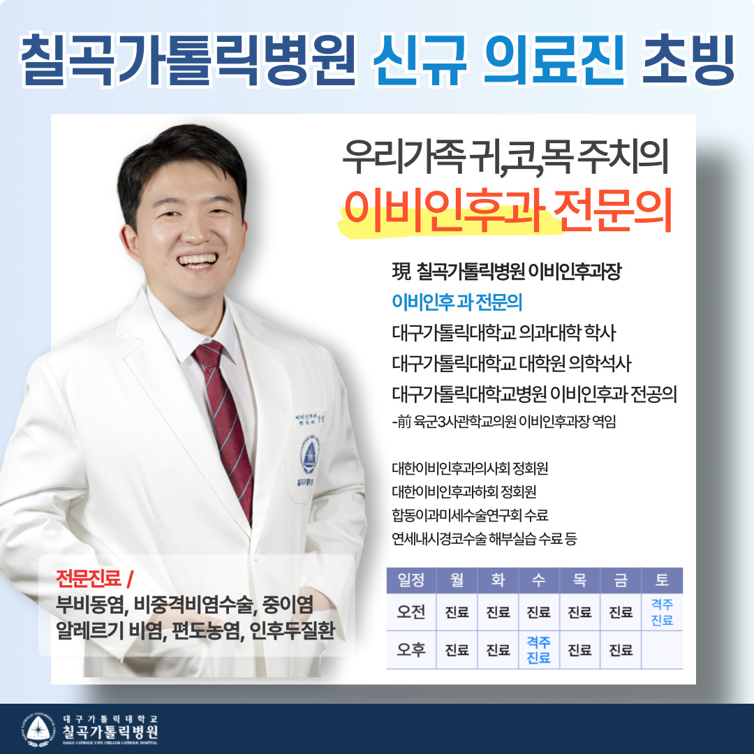 칠곡가톨릭병원 신규 의료진을 소개합니다! 칠곡가톨릭병원은 이비인후과 강병준 과장님과 함께 새로운 이비인후과 진료의 패러다임을 만들어 갑니다. 이번 의료진 초빙을 통해 많은 분들이 괴로워하는 비염, 축농증, 부비동염부터 내시경 수술까지 귀, 코, 목 등 안면 부위에 대한 포괄적인 진료를 제공합니다. 칠곡가톨릭병원에서는 새로 오신 이비인후과 강병준 과장님과 함께 더욱 양질의 이비인후과 진료를 제공하오니 많은 관심 부탁 드립니다 :) |
