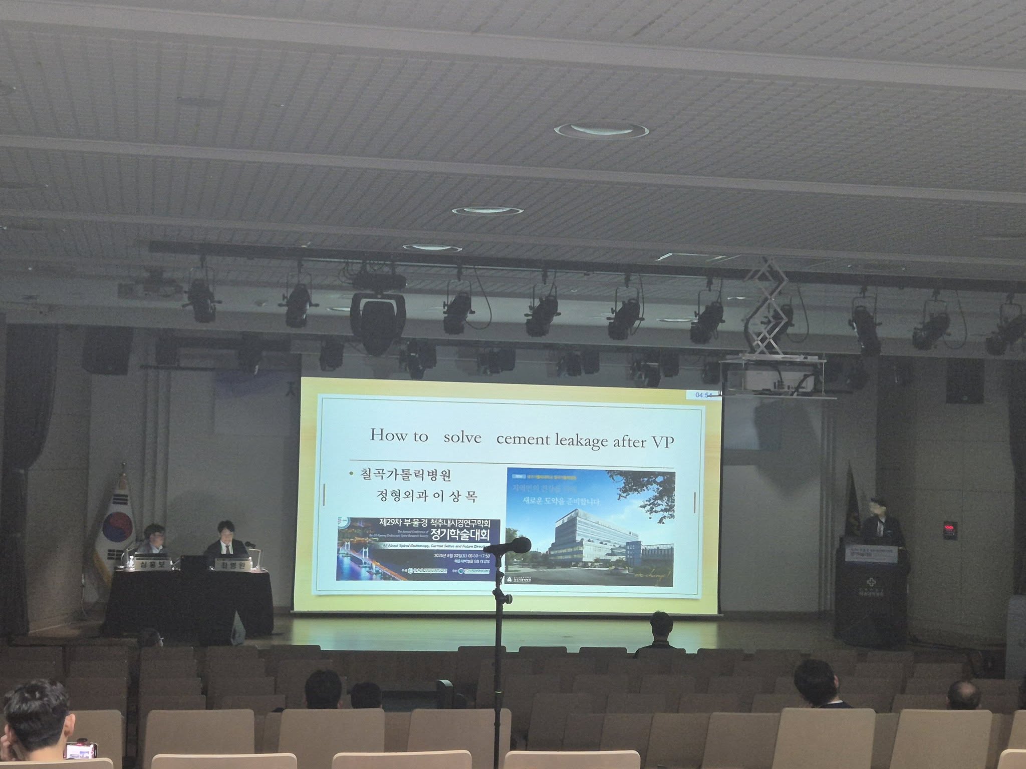 We change! 공감과 소통하는 칠곡가톨릭병원입니다. 지난 8월 30일 해운대 백병원 대강당에서 열린 부·울·경 척추내시경연구학회에 이상목 정형외과장님이 참석하여 발표를 하셨습니다! 많은 병원의 정형외과 교수님과 원장님이 참석한 가운데 저희 이상목 과장님이 발표연자로 참석하셔서 더욱 의미 있고 뜻깊은 자리였습니다! 이상목 과장님은 'how to solve cement leakage after VP' 라는 주제로 굴절된 척추에 시멘트를 주입하여 안정성을 높이는 시술인 VP(경피적 척추 성형술) 후 시멘트 누출을 해결하는 방법에 대해 발표 해주셨습니다. 많은 진료와 수술로 바쁘시더라도 더 나은 의료 서비스를 위해 꾸준히 연구를 하시고 도움을 주신 이상목 과장님께 격려의 박수를 보내드립니다! 칠곡가톨릭병원도 환자의 진료와 회복을 위해 끊임없이 연구하고 지역 의료 발전에 힘쓰는 병원이 되겠습니다.
