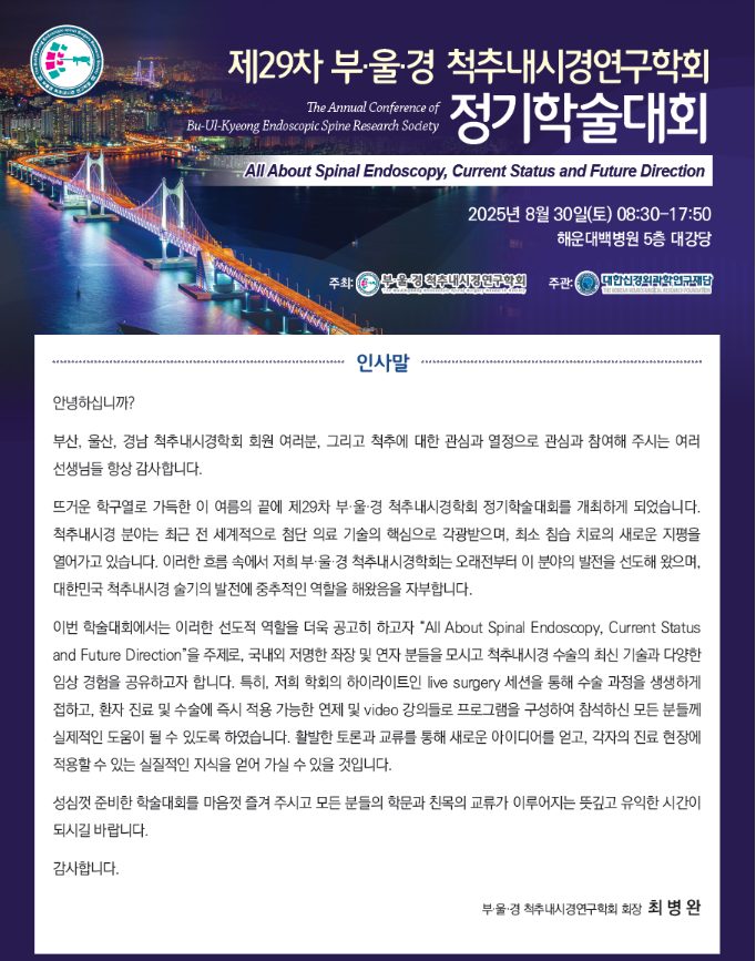 | [병원소식] 칠곡가톨릭병원 정형외과 이상목 과장, 제29차 부울경 척추내시경연구학회 정기학술대회 발표 | ||