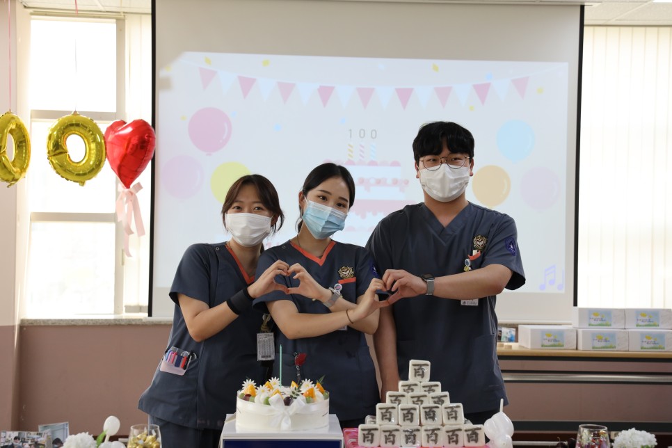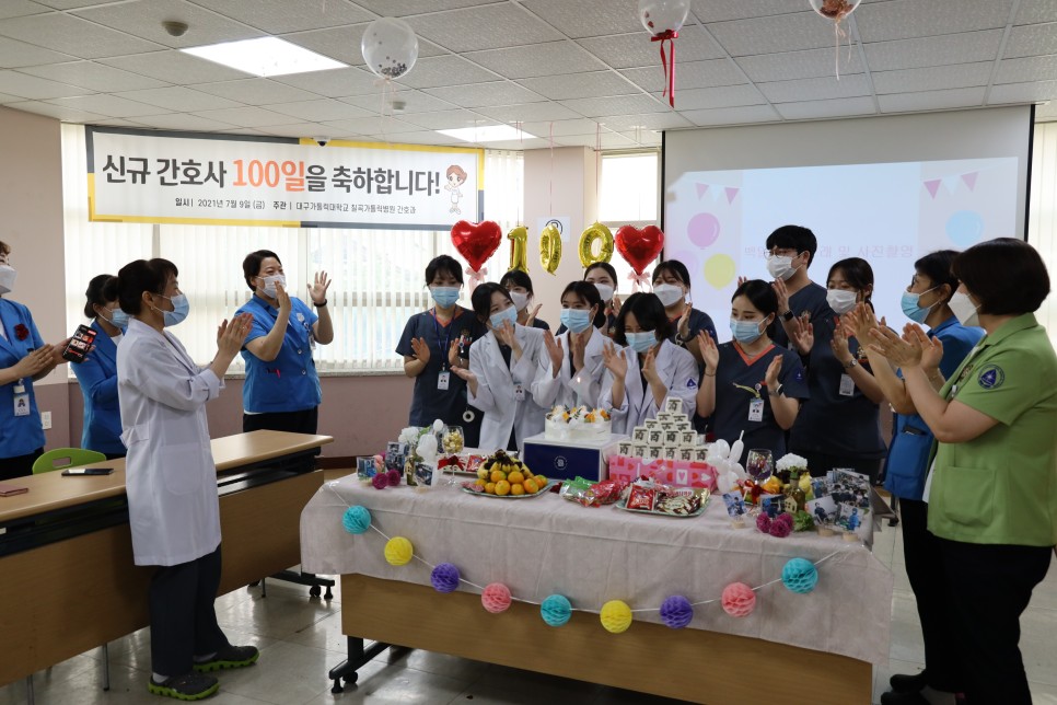 지난 7월 9일 칠곡가톨릭병원에서는 신규간호사를 대상으로 100일 기념파티가 있었습니다. 모두가 바쁜 업무에도 불구하고 신규간호사 선생님들의 100일을 기념하기 위해 모두 한걸음에 달려와 주셨습니다. 오늘의 자리가 신규간호사 분들이 앞으로 간호사 생활을 하면서 힘든 시간이 다가왔을 때 오늘의 기억을 되짚어 보며 다시 한번 에너지를 얻을 수 있는 자리가 되었으면 좋겠습니다. 1년 동안 칠곡가톨릭병원과 함께 하며 많은 성장을 이뤄낸 신규간호사 선생님들과 격려와 응원의 말씀을 아끼지 않고 해주신 프리셉터 선생님과 수간호사 선생님들께 감사의 인사를 드리겠습니다.