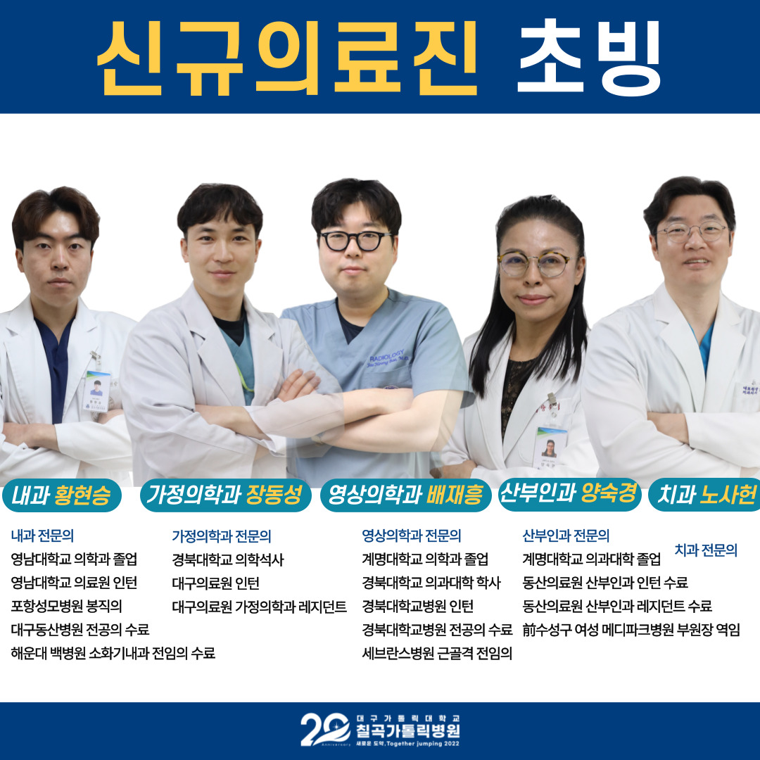 새로운 도약, Together jumping 2022! 칠곡가톨릭병원입니다. 칠곡가톨릭병원에서는 더욱 전문적인 의료서비스를 제공하기 위해 5명의 우수한 전문의를 초빙하였습니다!
